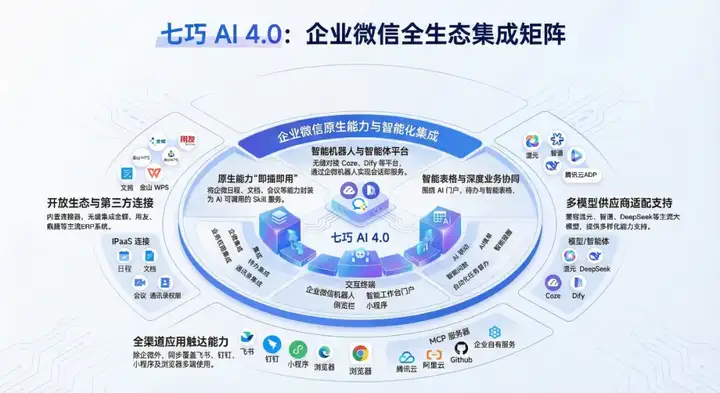 而道一云作为腾讯战略投资、企业微信生态最深度的核心合作伙伴,与企微有着8年的深度共创经验,七巧4.0实现了与企业微信AI 5.0原生深度融合,核心优势完全区别于市面竞品的表层对接: