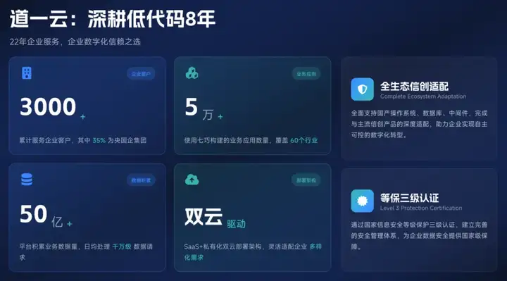 道一云深耕企业数字化赛道22年,服务覆盖60+行业、70万家企业,其中35%的七巧客户为央国企集团,全国98家央企中62家选择企业微信,23家全集团私有化部署的标杆央企中,14家选择了道一云。从国家电网、中国石油,到南方电网、中国建筑,大量央国企的标杆案例,充分验证了七巧低代码的稳定性、适配性与服务能力。